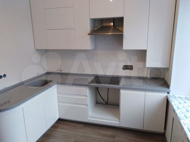 kuhnya bez ruchek fasady shpon derevo seroe verh kraska belaya mdf