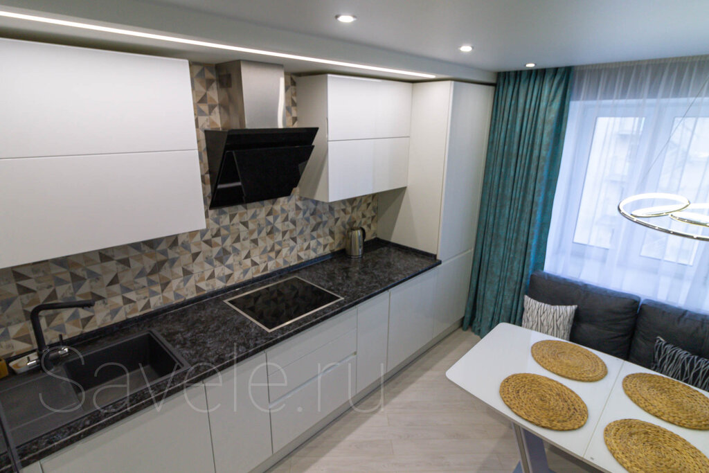 belosnezhnaya kuhnya s chernoj keramikoj